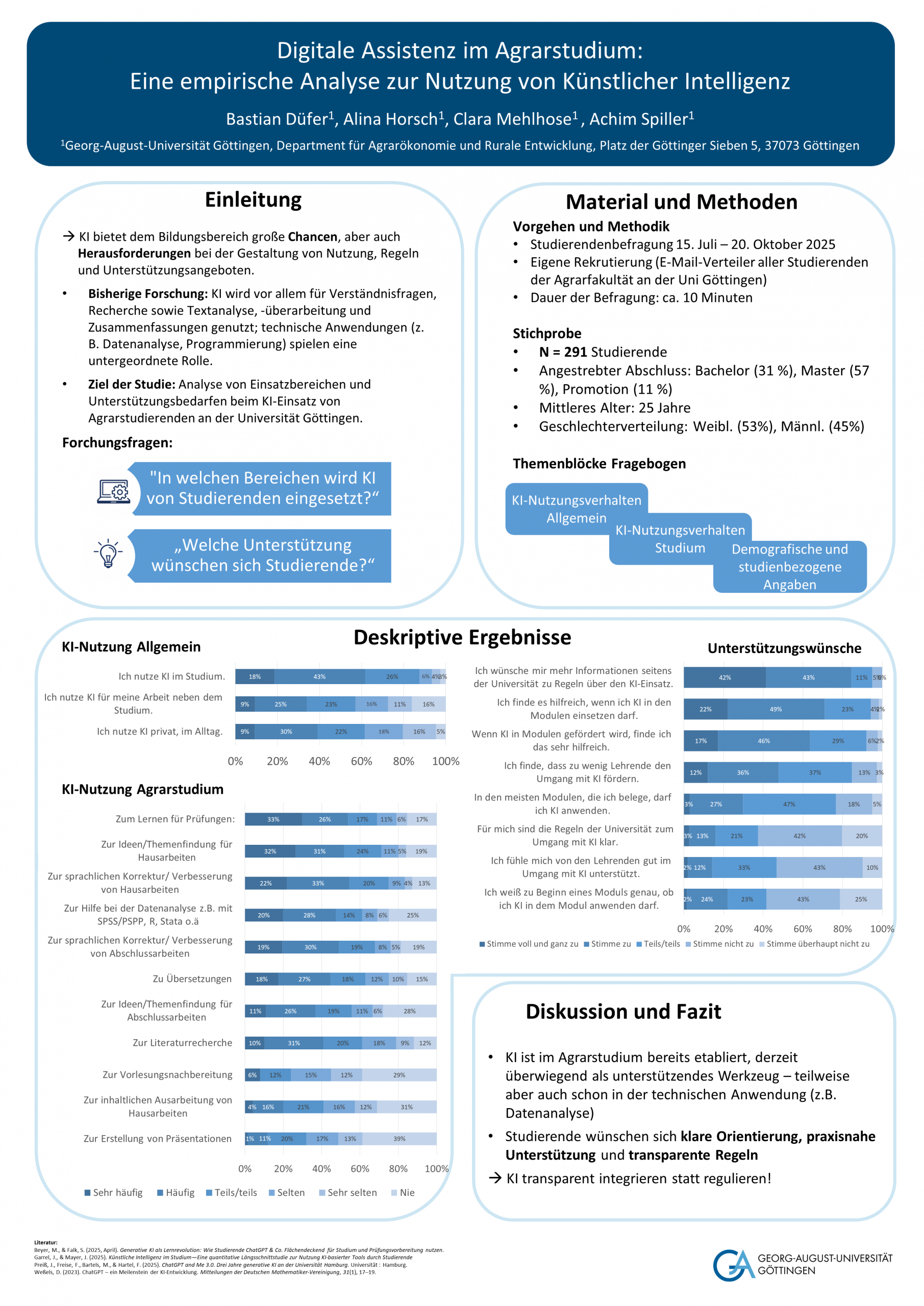 Diese Einschätzung wurde durch ein in der Postersession vorgestelltes Projekt zur „Digitale Assistenz im Agrarstudium: Eine empirische Analyse zur Nutzung von Künstlicher Intelligenz“ (siehe Bild) empirisch unterfüttert. Die Ergebnisse zeigen, dass KI im Studienalltag bereits weit verbreitet ist, zugleich aber ein hoher Bedarf an klaren Regeln, Transparenz und didaktischer Einbettung besteht.